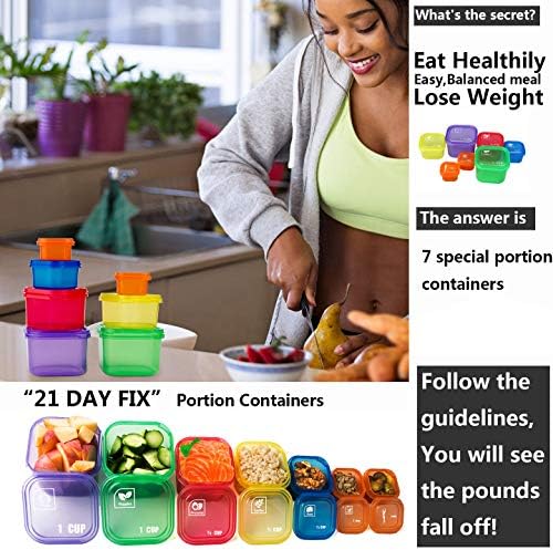 21-Days Portion Control Container Kit: great for anyone trying to lose weight or manage portion sizes. BPA-free, DEHP-free, top-rack dishwasher safe and microwave safe. Each lid includes a food icon and unique color, making the containers easily identifiable for each food category.
