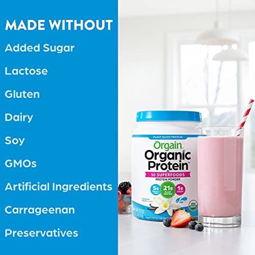Orgain Organic Protein & Superfoods is a nutritional powerhouse with all-in-1 convenience. Organic Protein & Superfoods features 21 grams of organic, plant based protein and 50 organic superfoods, alon grams with a healthy serving grams of organic fiber. With Organic Protein & Superfoods you can save the time, expense, and mess of numerous powders and supplements and get your nutrition in one smooth and delicious serving. This powder makes a great meal replacement, smoothie booster, or post workout replenishment. USDA certified organic, gluten free, soy free, and Non GMO.