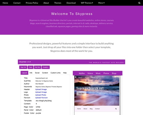Skypress is a Universal Site Builder that let’s you create beautiful websites, online stores, courses, blogs, search engines, business directory, portals, internet tv & radio, desktops, delivery service, classified ads, squeeze pages, gaming sites & more instantly.